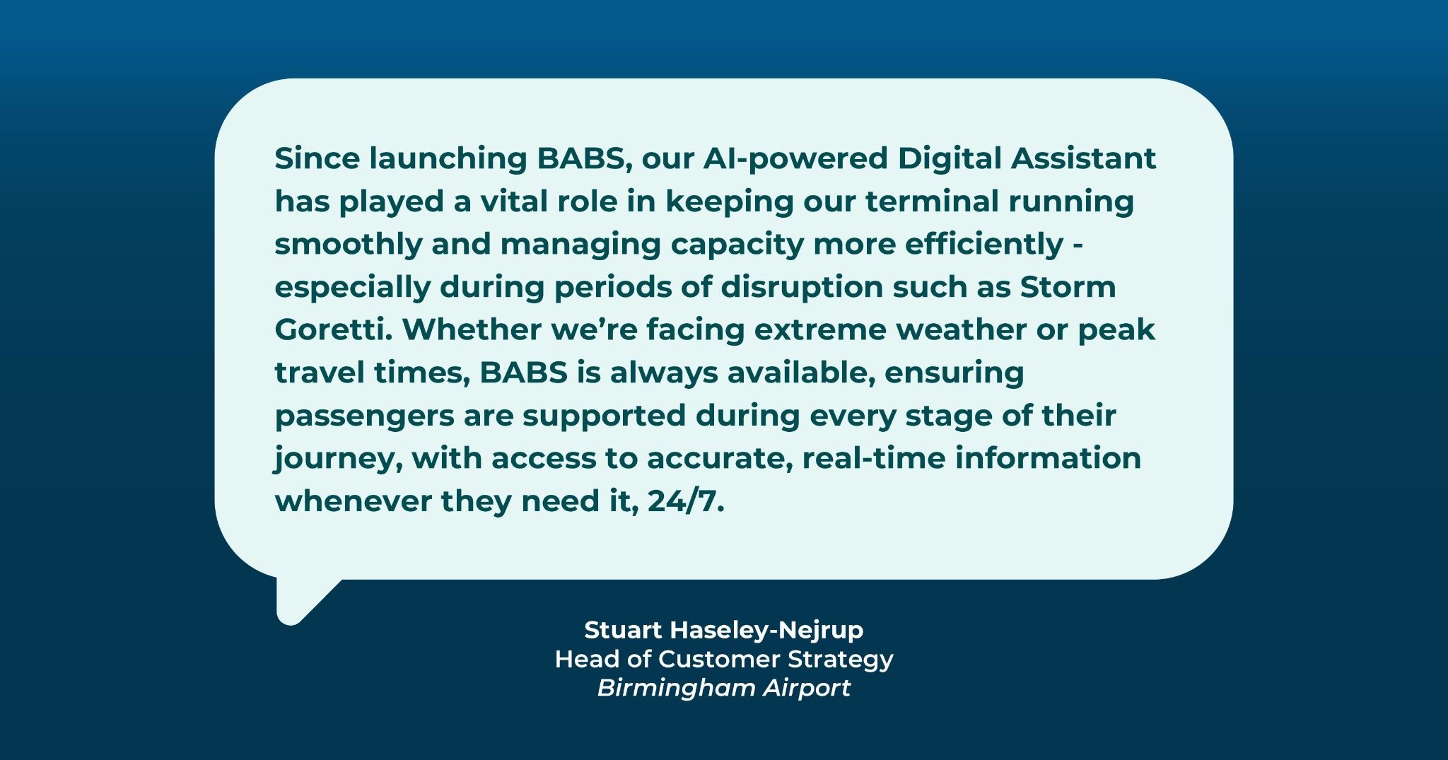 No matter how bad the weather gets outside, Birmingham still has a reliable way to keep passengers informed. It means when staff are unable to make it to the airport themselves, the pressure is taken off the rest of the team - as those routine questions are handled by our Digital team member, allowing frontline staff to focus on what really needs their attention.